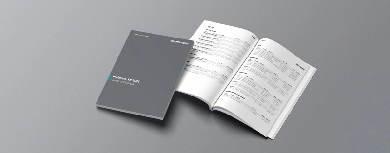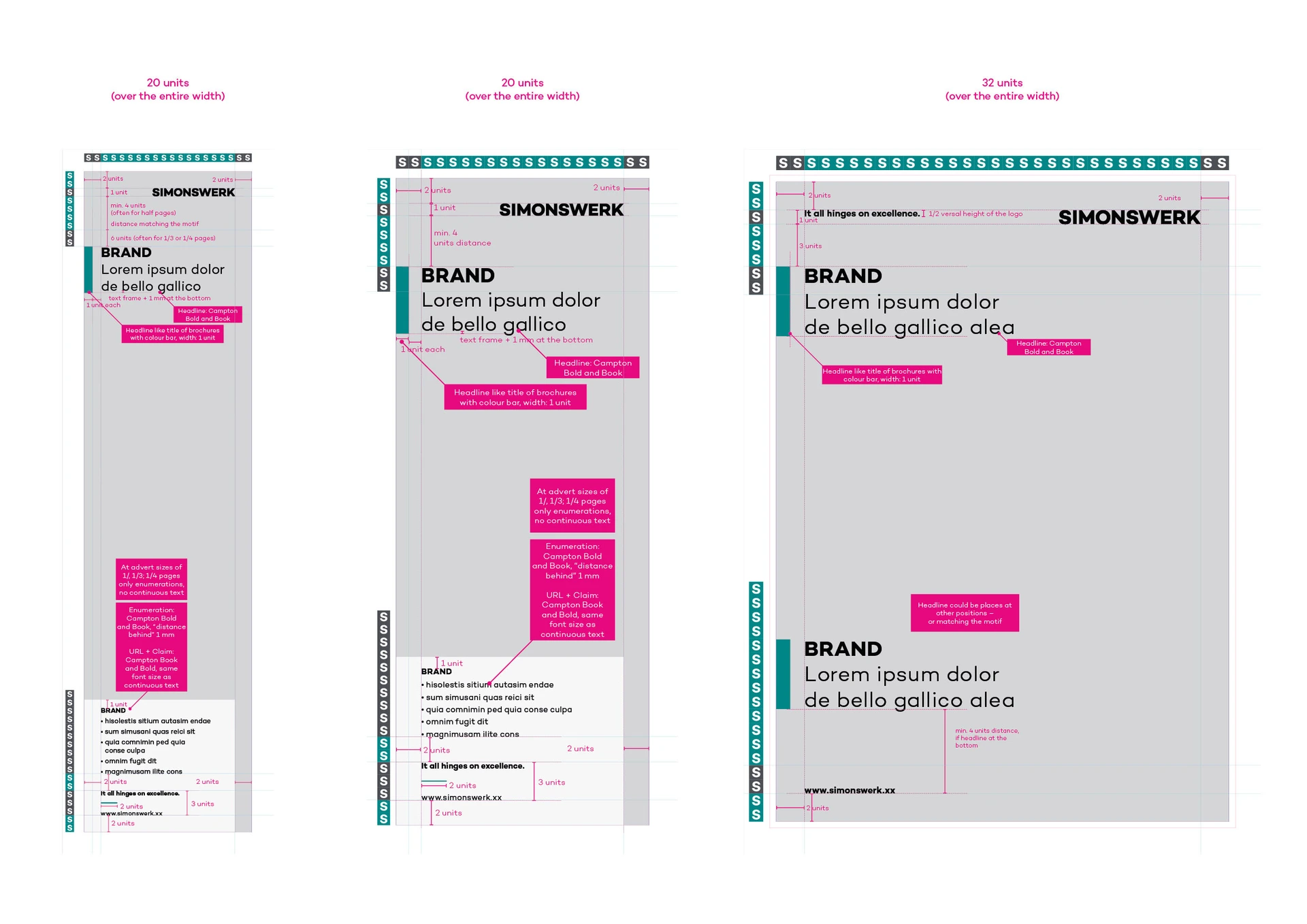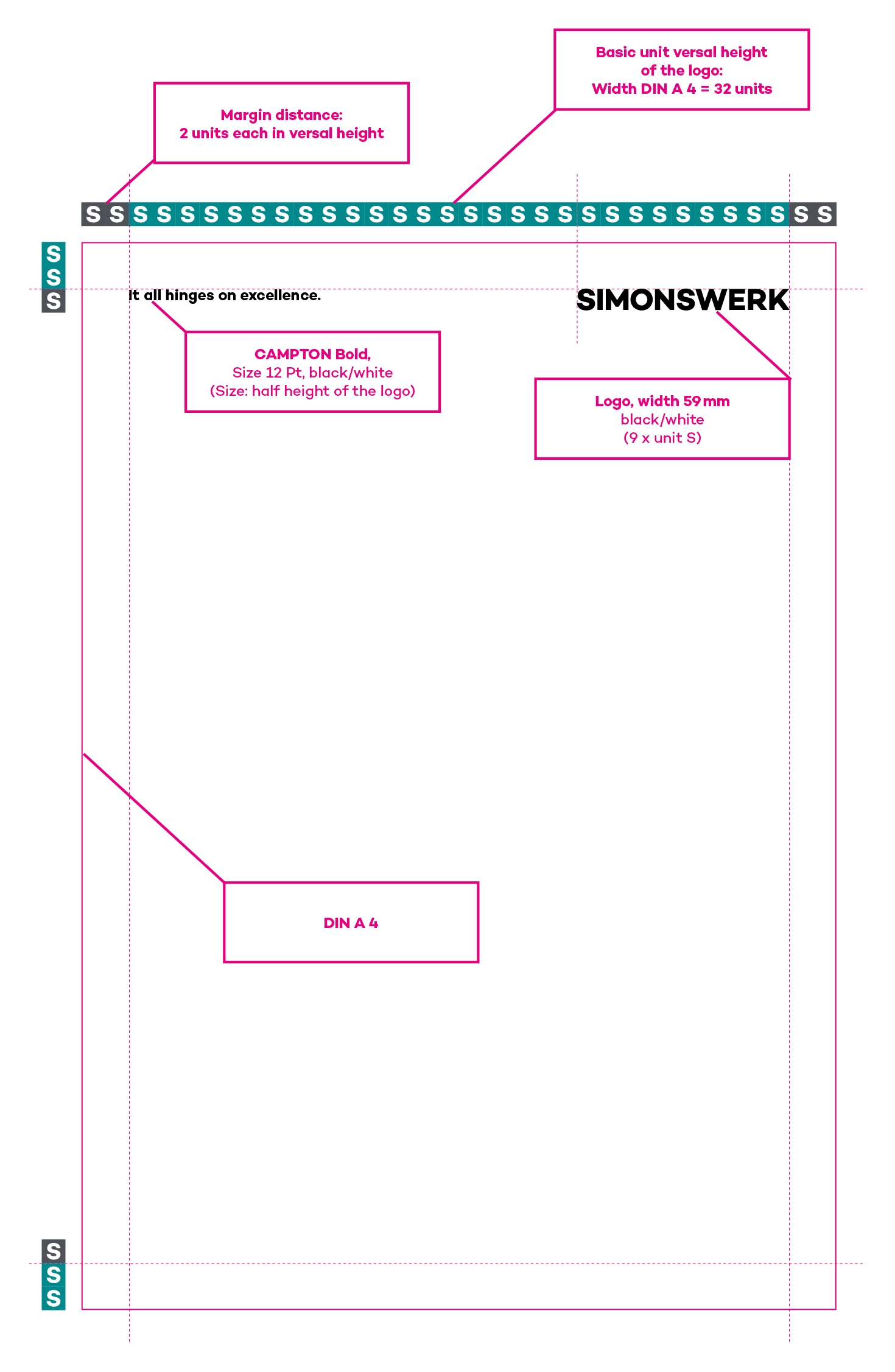 The logo has defined sizes on standard formats, e.g. on DIN A4 brochure titles. Here, the page is based on a fixed grid that results in the logo size. The claim is aligned with the top edge of the logo and is in a fixed ratio to the logo size: half the height of the logo.