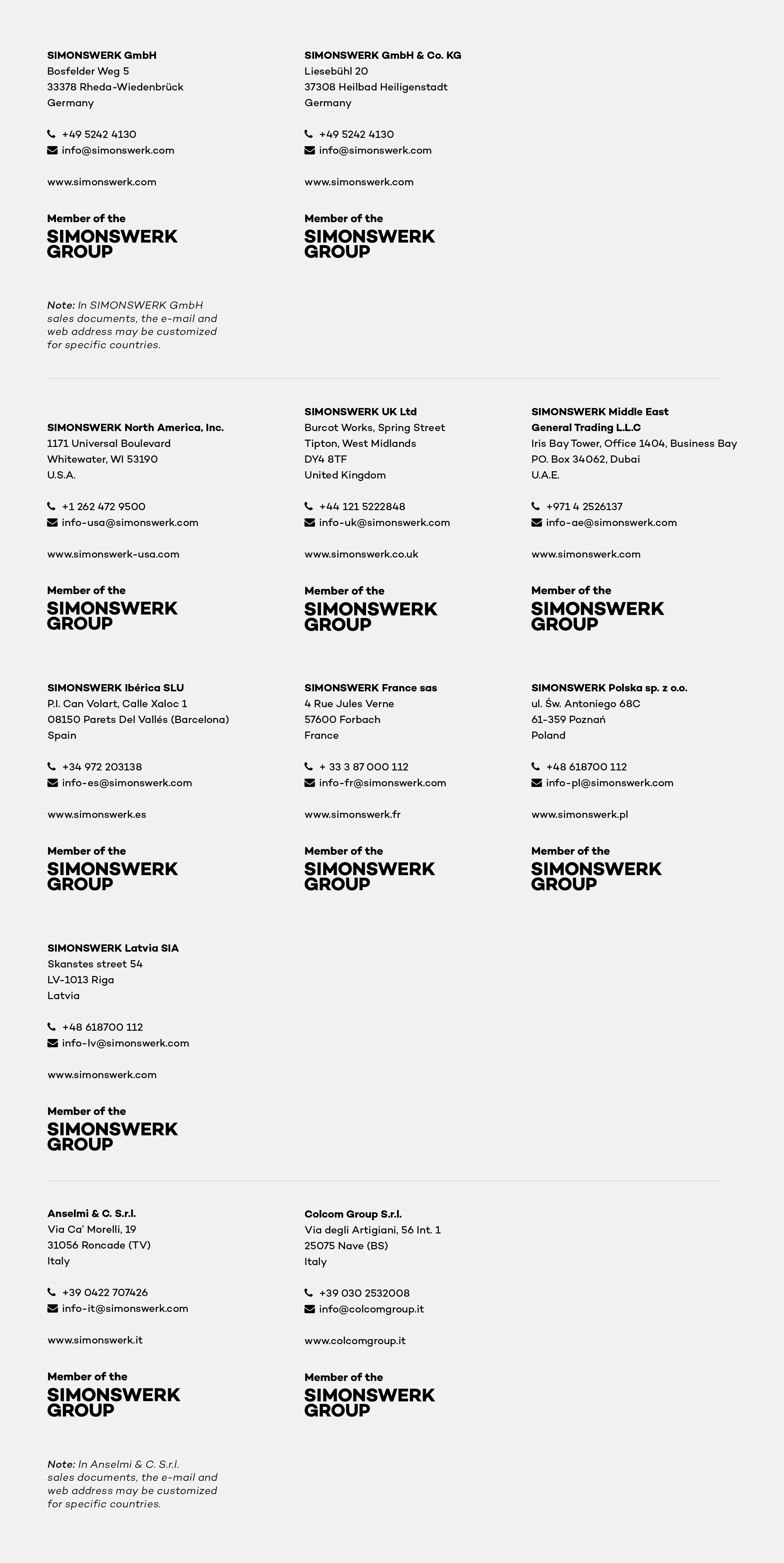 Within the context of providing address details for the various companies under the SIMONSWERK sales brand, clear guidelines regarding presentation and positioning must be followed. The Group's endorsement is always included.