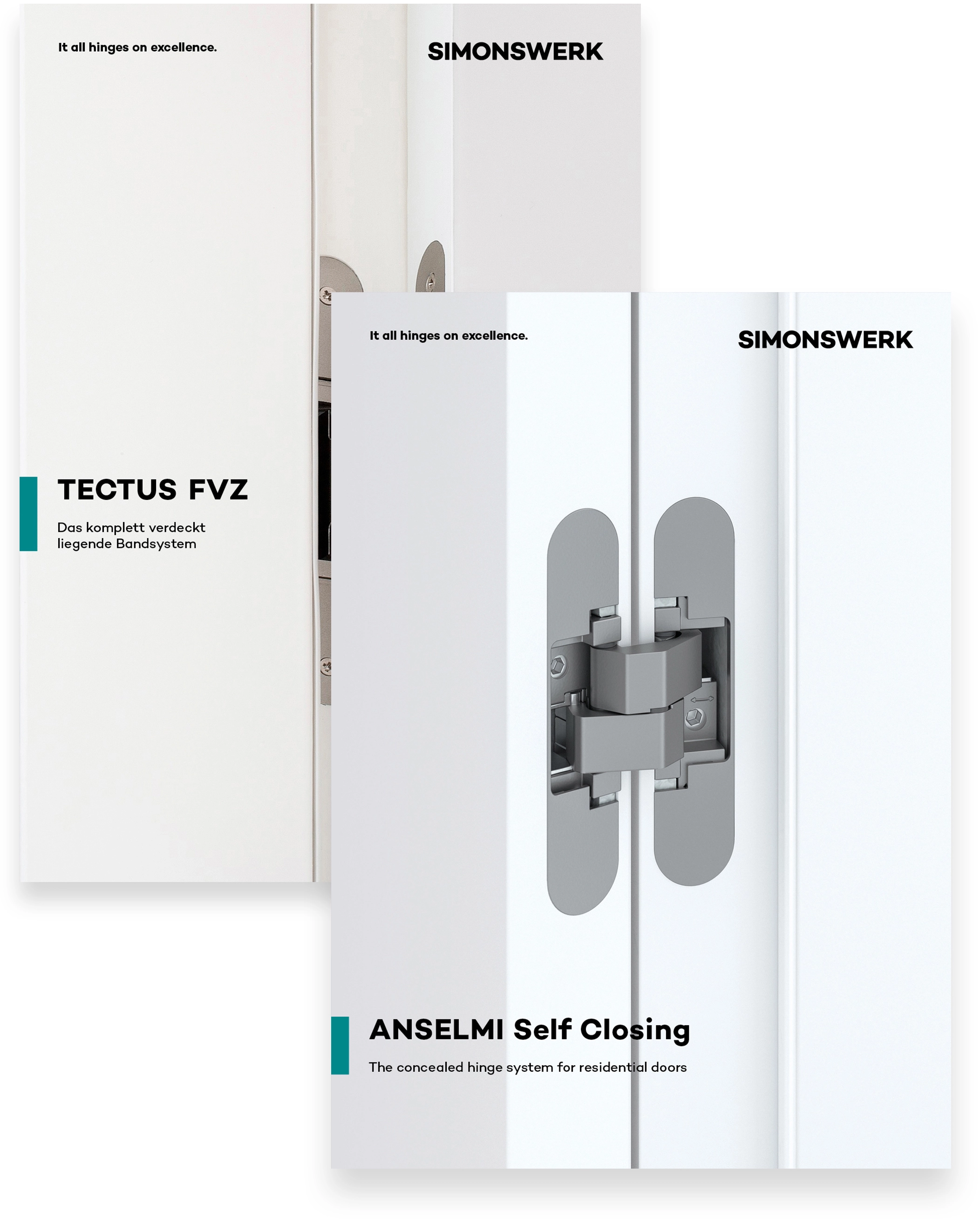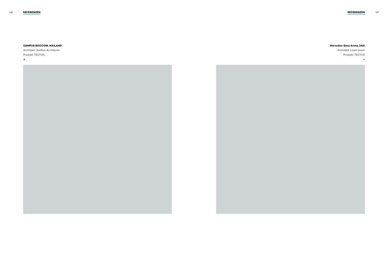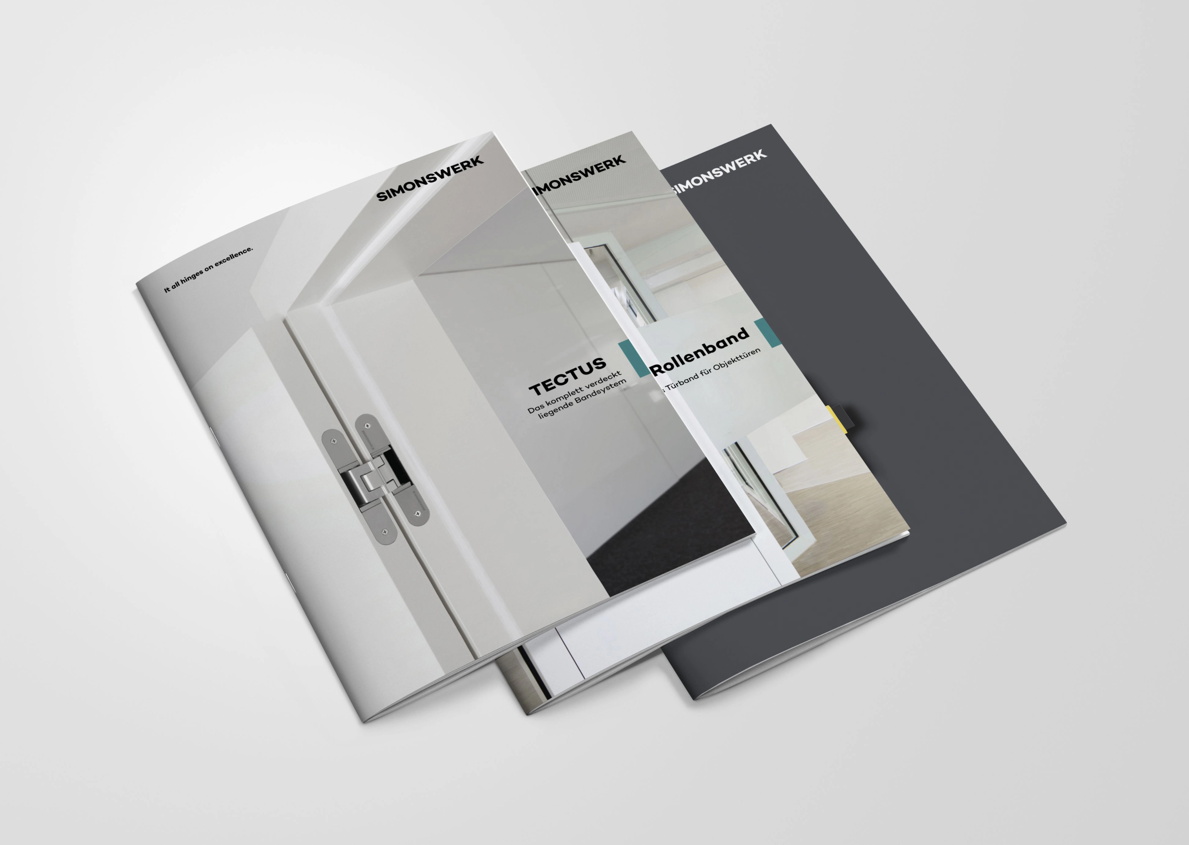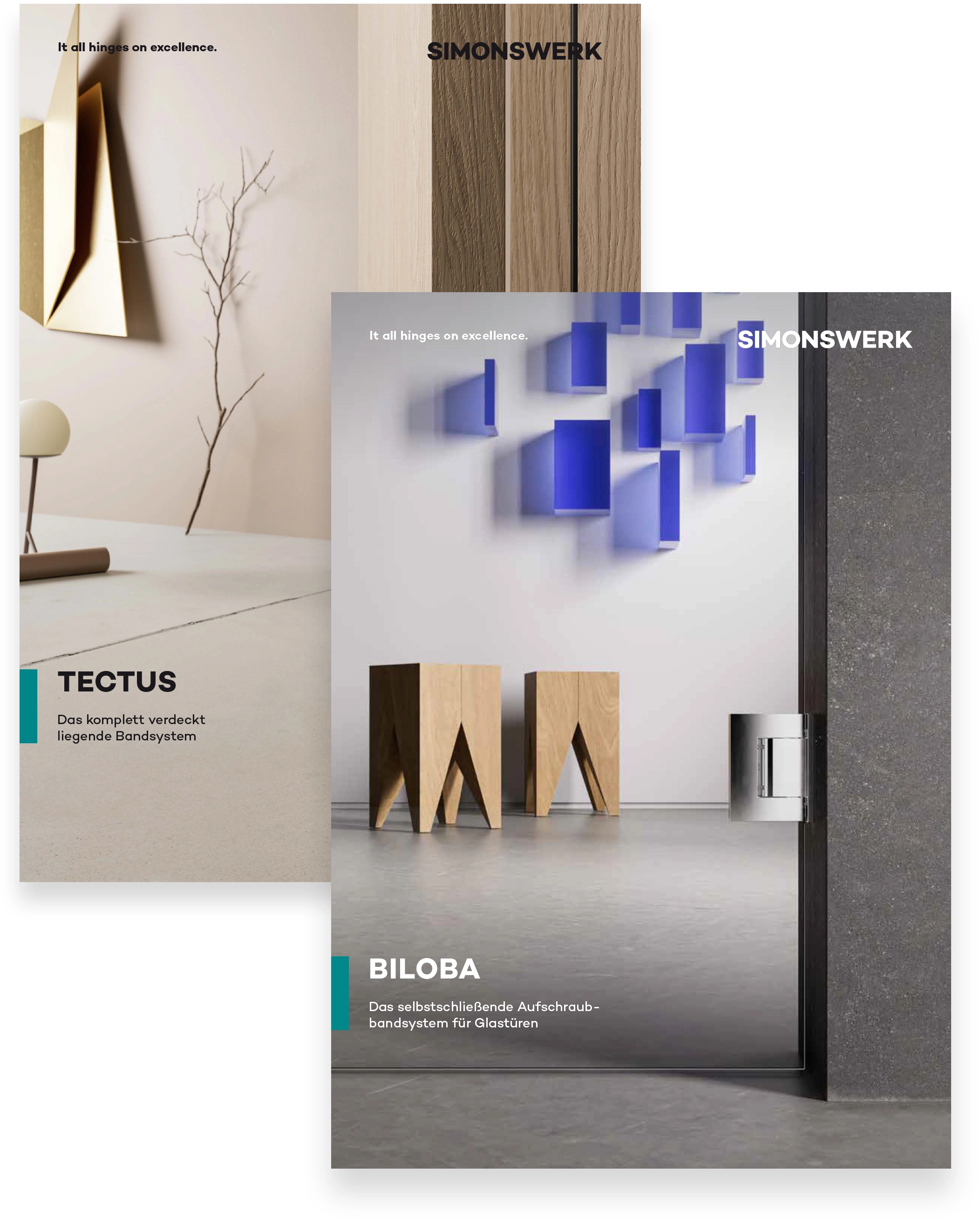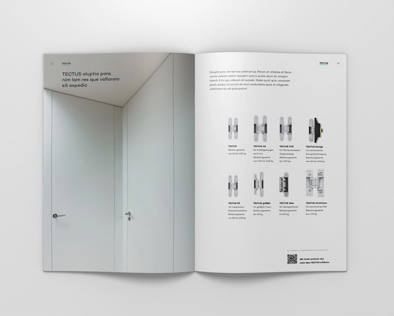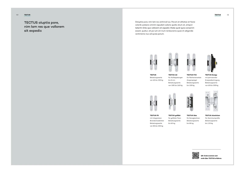 Product brochures each represent a product brand, e.g. TECTUS or BILOBA. They are divided into an intro section, which highlights all the essential features of the product brand, and a product section with selected technical information on the product areas.
