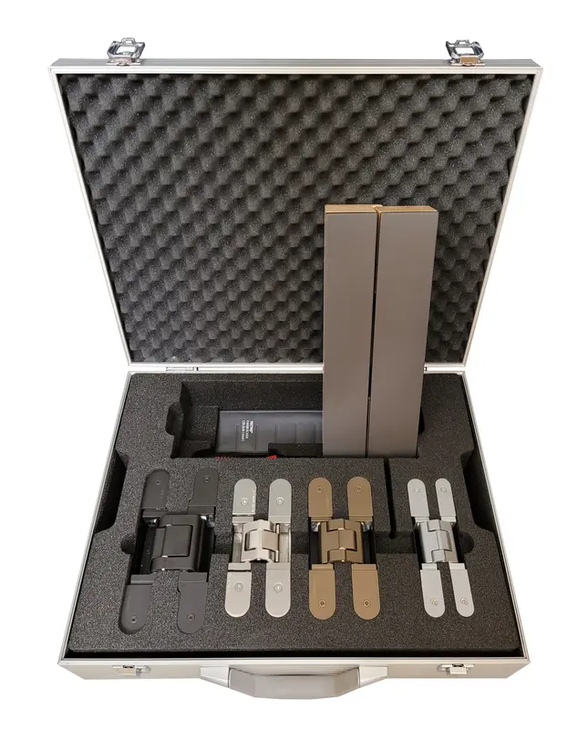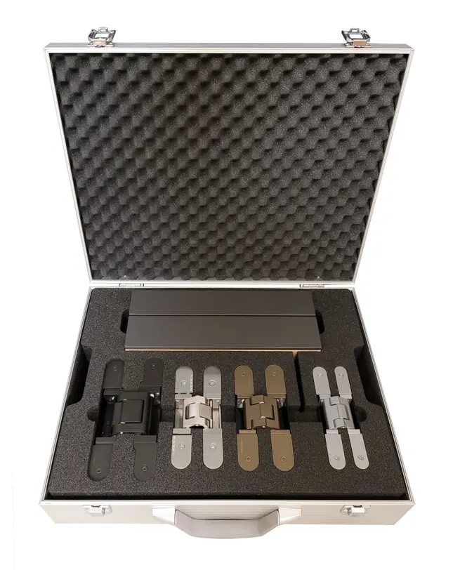 Sample cases are the perfect way to showcase SIMONSWERK product brands and transport them safely. For a harmonious overall appearance, the cases always consist of a silver-colored aluminum case with corresponding branding.